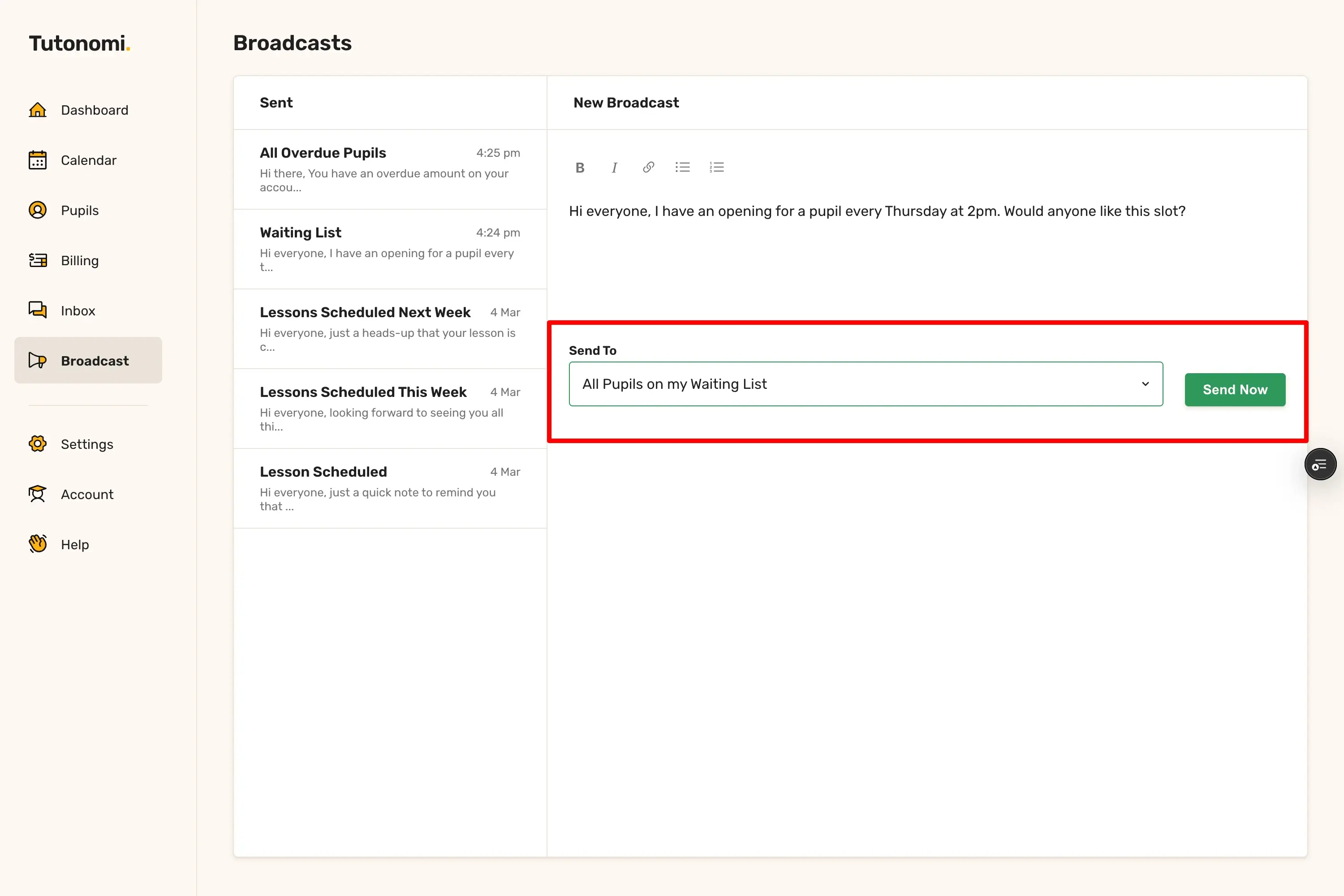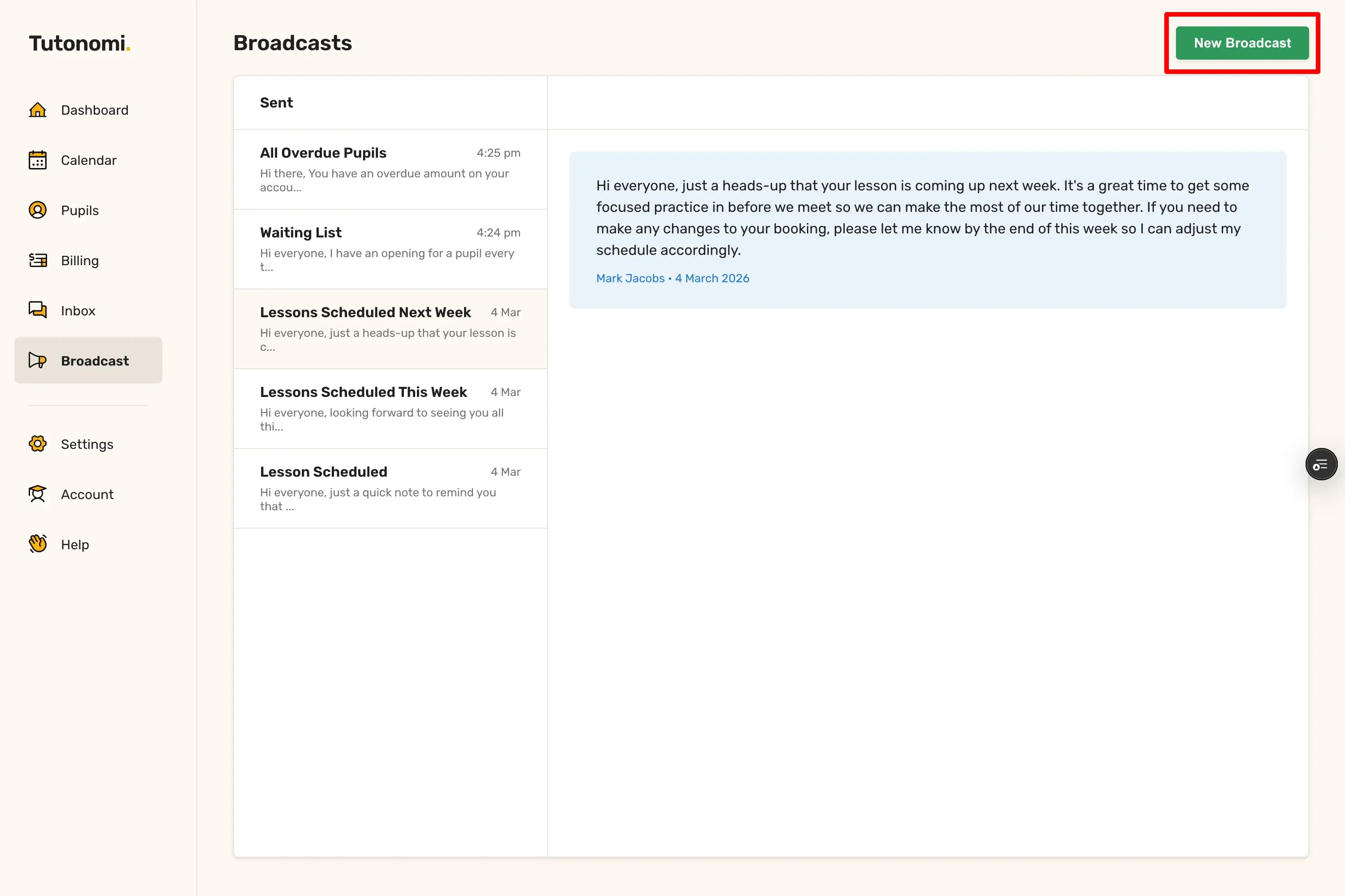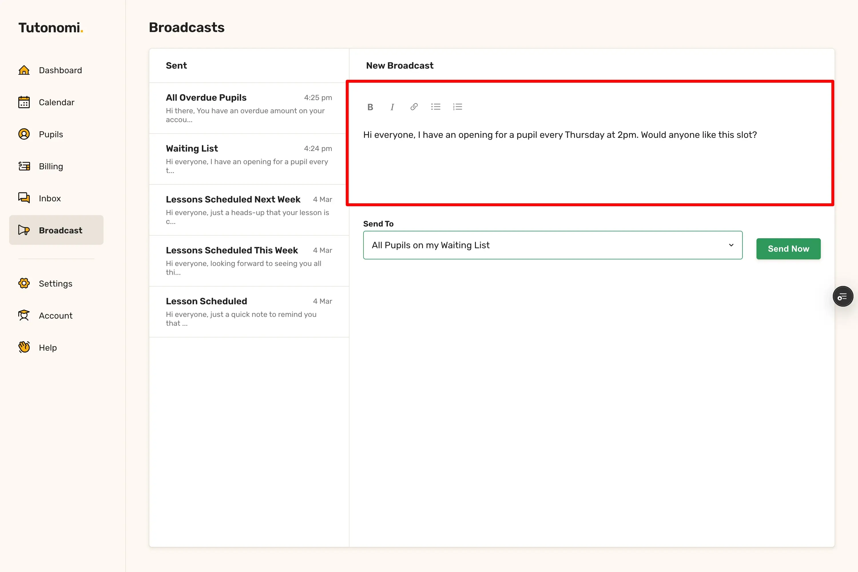 Sent broadcasts are saved in the left-hand panel so you can refer back to what was sent and when.