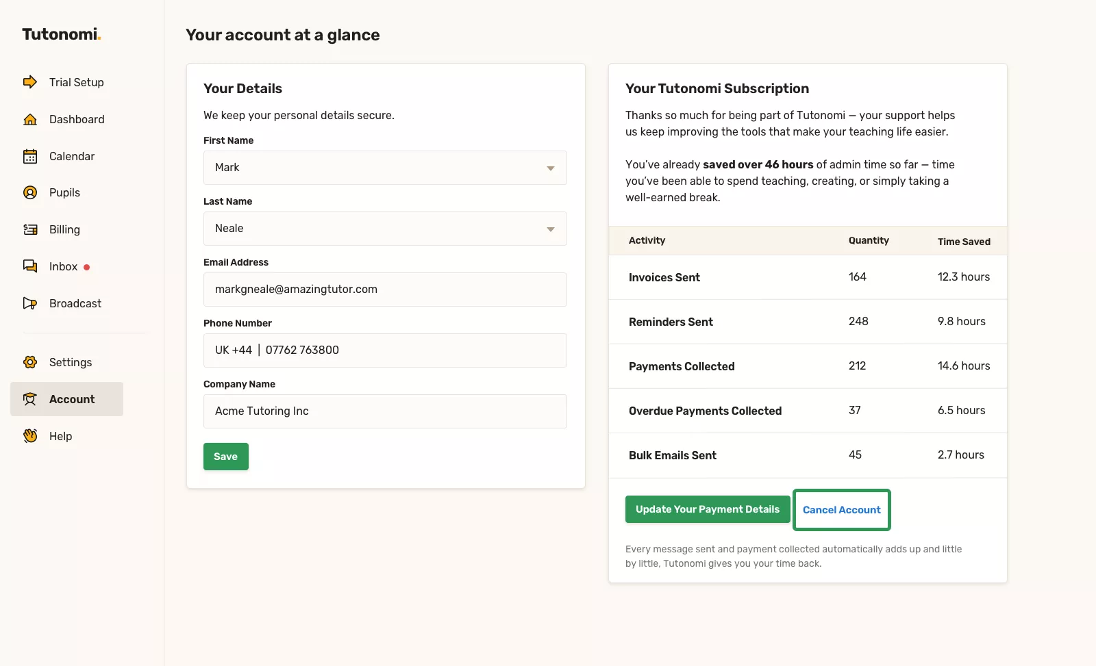 On the right-hand side, under Your Tutonomi Subscription, click Cancel Account.