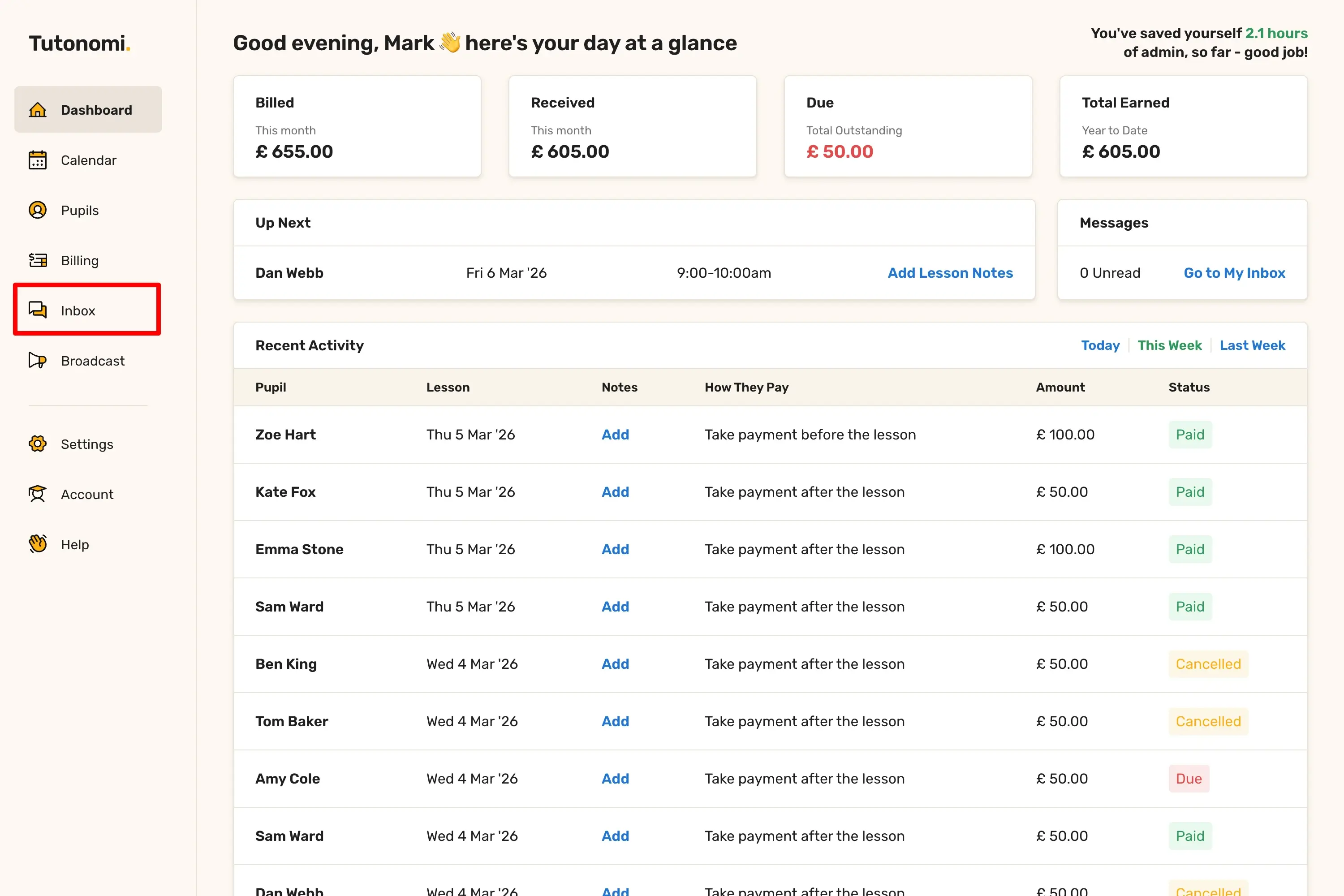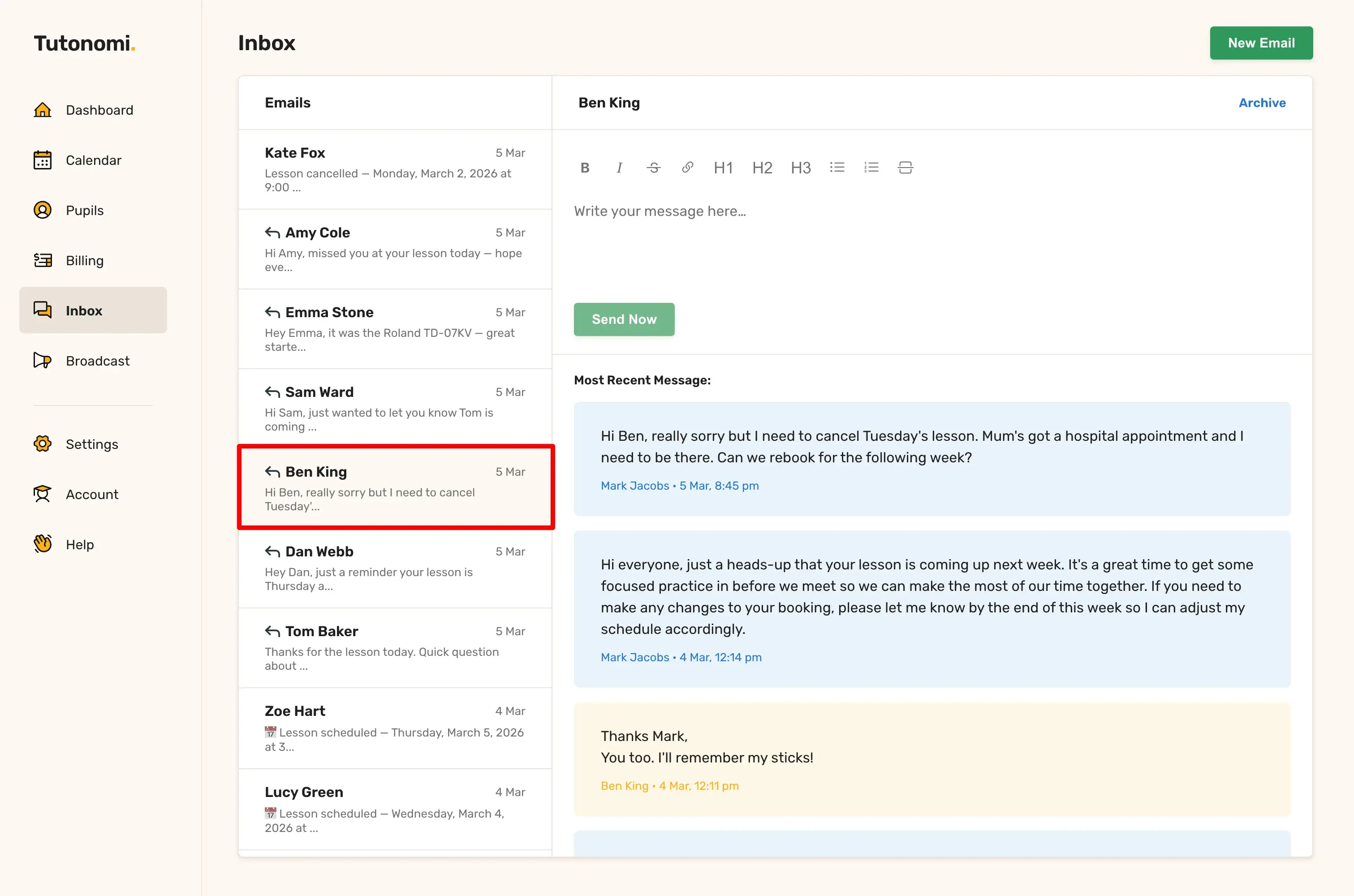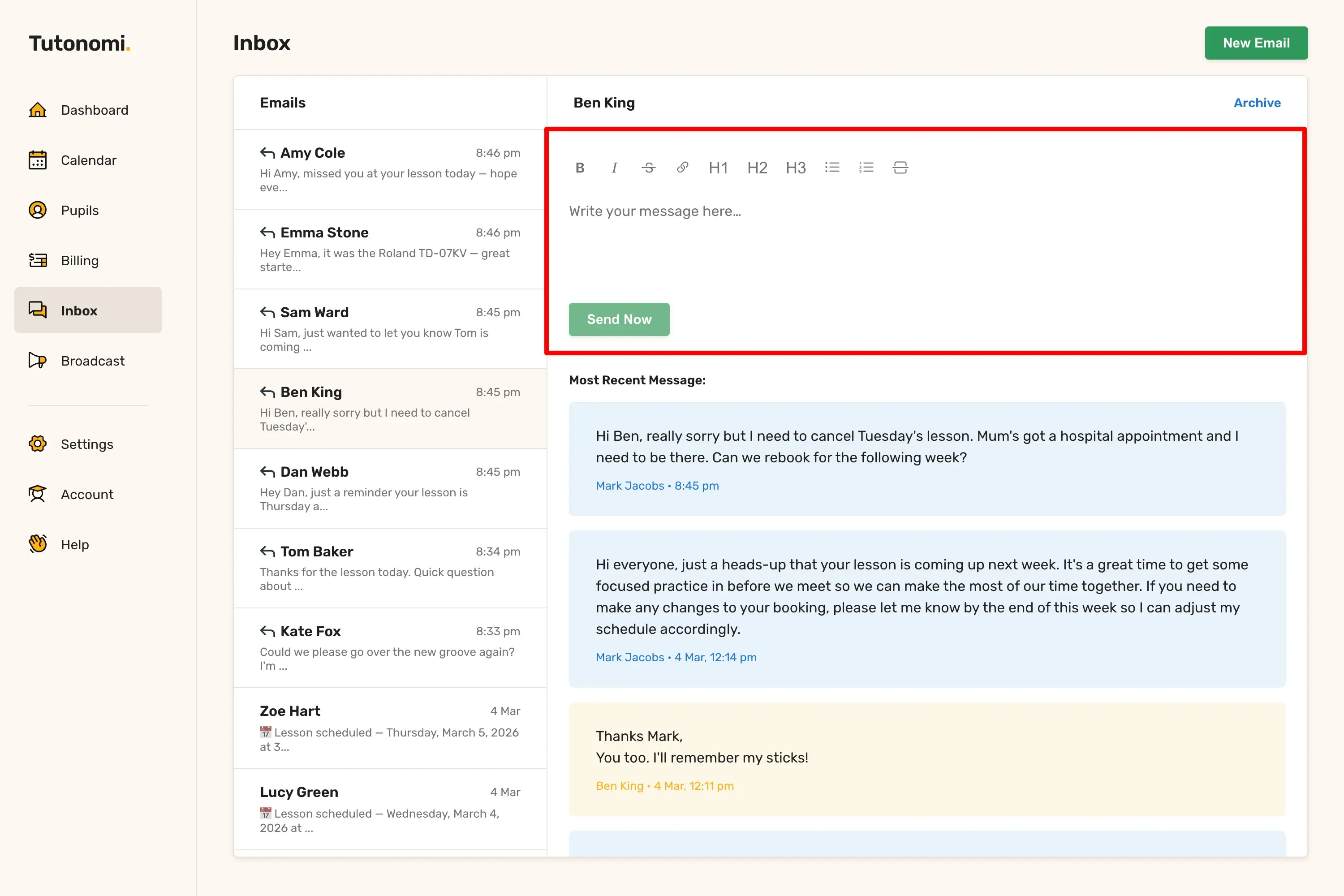 Here's how to send a message to a pupil directly from Tutonomi.