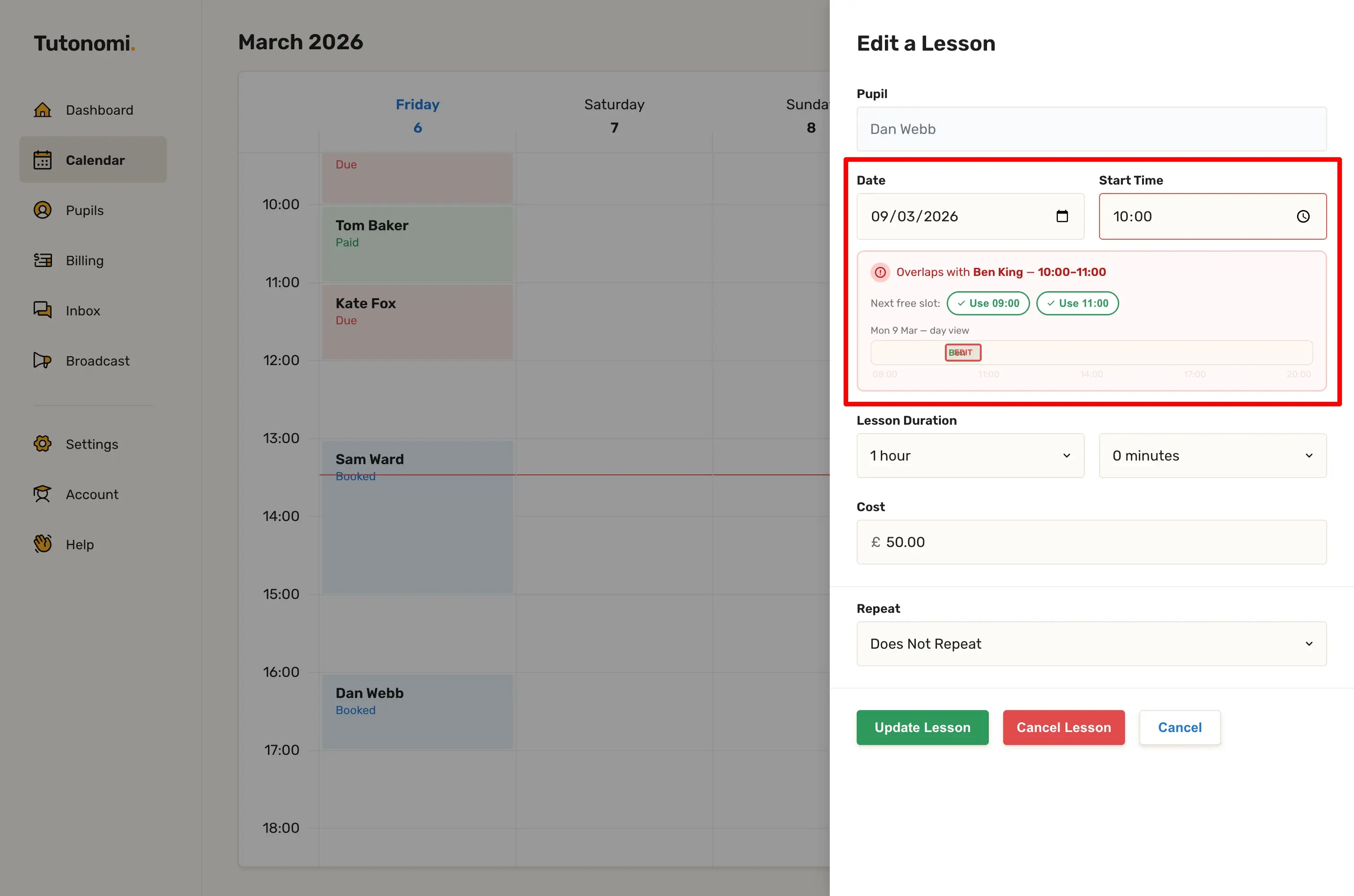 If the new time overlaps with another lesson, Tutonomi will flag it and show you a mini view of the day. You can either adjust the time manually or use the Use 09:00 / Use 11:00 suggestions to jump straight to the nearest free slot.