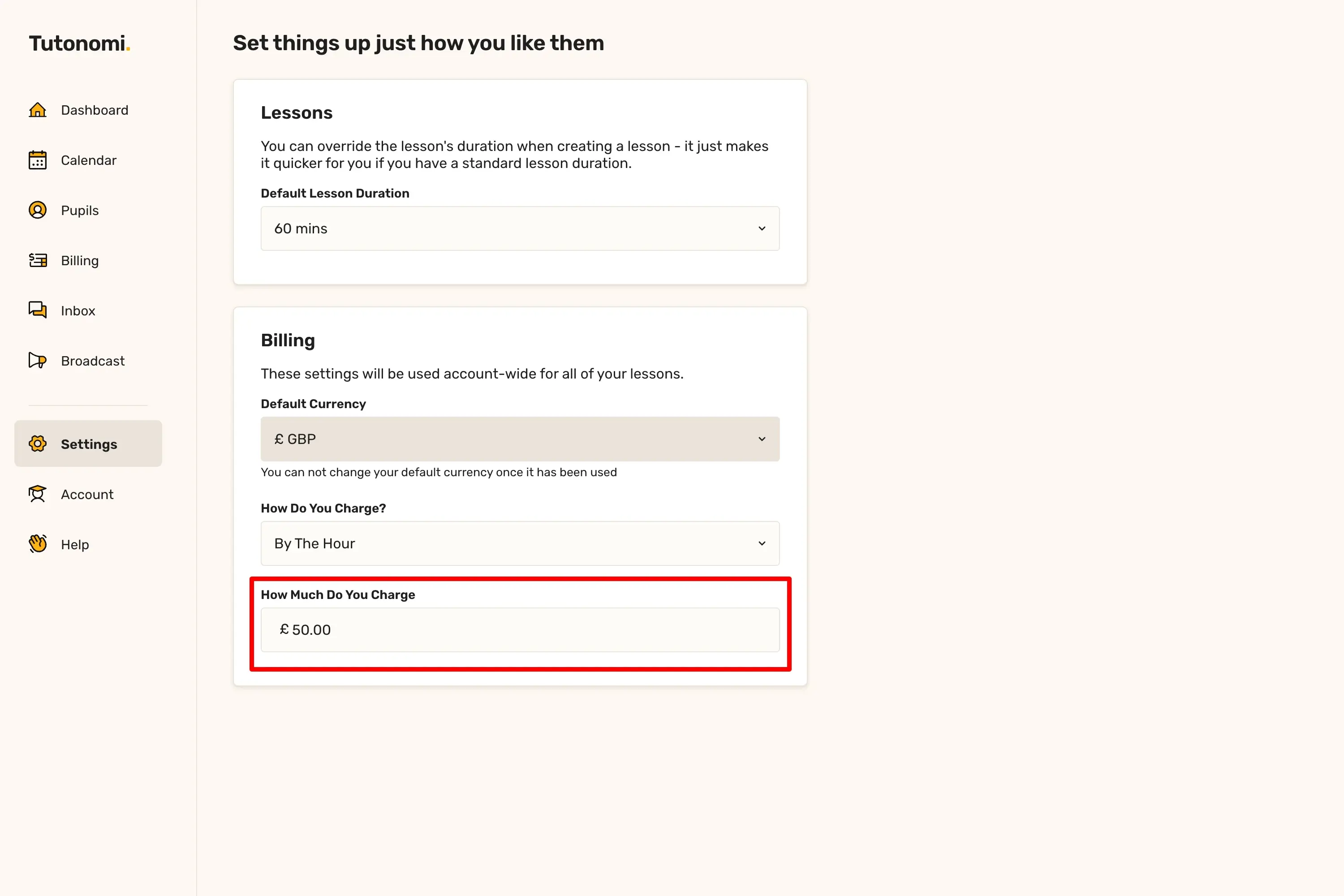 Here's how to set the rate Tutonomi uses as your default when calculating lesson costs.