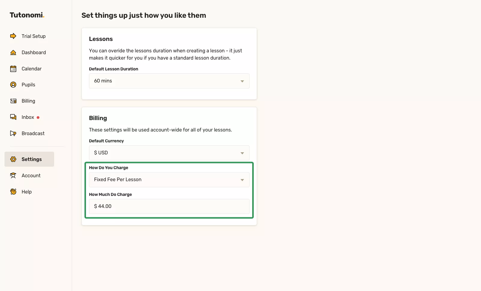 Learn how to set your default hourly rate in Tutonomi so new lessons are priced correctly from the start.